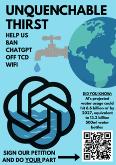 Unquenchable Thirst: OpenAI's Drinking Water Usage and How Trinity Can HelpThe environmental impact of using generative AI is incomprehensible to the general public. In 2025 alone, the data centers used to run OpenAI tools were responsible for 32.6 - 79.7 million tonnes of CO2 emissions. According to OpenAI engineers, clean drinking water must be used to cool the data servers in order to prevent "mineral build-up" in the cooling systems. Data centers are literally using one of humanity's most precious and scarce resources to cool their servers, and it is dwindling by the day. OpenAI's projected water usage could hit 6.6 billion m³ by 2027, which is equivalent to 13.2 billion 500ml water bottles. Although this issue seems out of our hands, students can do their part by helping ban ChatGPT from the Trinity College Dublin Wi-Fi. ChatGPT is the most widely-used generative AI model, thus, blocking access would drastically reduce students' contribution to this ever growing problem. You can help do your part by signing our petition!84 of 100 SignaturesCreated by Ella Flynn