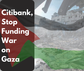 CitiBank: Stop fuelling War on GazaCitibank is one of the dirtiest banks in the world. Israel is one of its most important markets. Citibank has facilitated the purchase of weapons by the Israeli military and we are seeing the devastating results of this. Already the second largest funder of fossil fuels in the world, it is giving more money to fossil fuel companies such as BP who are exploiting the war on Gaza to drill for gas off Gaza's coast. Over 25,000 people have been killed over 100 days of Israel's onslaught in Gaza. Hundreds of thousands are at risk of disease and starvation as Israel refuses to allow aid to enter. Despite this mass suffering, Israel is planning to extract the natural resources off the coast of Gaza through licensing, drilling and extraction. This is all underpinned by funding from Citibank. We know that only outside pressure can stop Israel. Citibank has its main European offices in Belfast and Dublin, and has received over £40 million in public money from Invest NI. We need to take a strong stand across this island against Citi profiting from Israel's brutal attack on the people of Palestine.882 of 1,000 Signatures