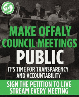 Live Steam Offaly County Council MeetingsToo many people in Offaly feel shut out of politics. Live streaming council meetings would finally let everyone see what’s really happening, hold councillors to account, and help rebuild trust in how Offaly is governed.306 of 400 SignaturesCreated by Aoife Masterson