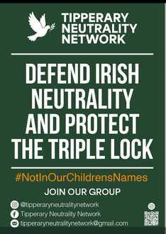 Tipperary Neutrality Network call to Defend Irish Neutrality and Protect the Triple LockIreland must remain a neutral and independent voice for peace. Our neutrality and the Triple Lock safeguard our democracy, sovereignty, and peacekeeping — not war-making. We, the undersigned, call on Tipperary County Council to: • Publicly affirm its support for Ireland’s policy of military neutrality; • Call on the Irish Government to protect the Triple Lock mechanism; • Support a policy of peace, diplomacy, and international co-operation. Ensure any deployment of Irish troops abroad remains subject to the will of the people and the Oireachtas. The “Triple Lock” that requires a UN mandate for deployment of Irish troops is the only legal mechanism that protects it. This government wants to scrap the Triple Lock so Ireland can participate more fully in EU-led and NATO-led military missions without a UN mandate.87 of 100 SignaturesCreated by Rhona Carroll
