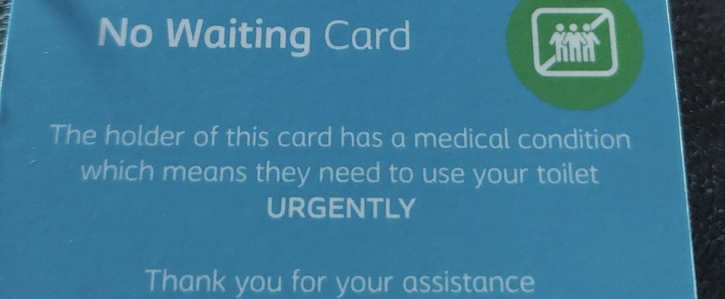 The lack of public toilets and the "No wait card" having no legal recognisation, means that when out in public spaces, there are no public toilets , and shops and businesses can refuse access to toilets